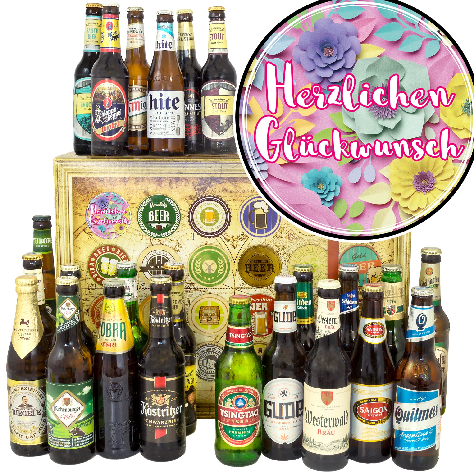 Herzlichen Glückwunsch Blumen | 24 Spezialitäten Bier aus Welt und Deutschland | Bierbox