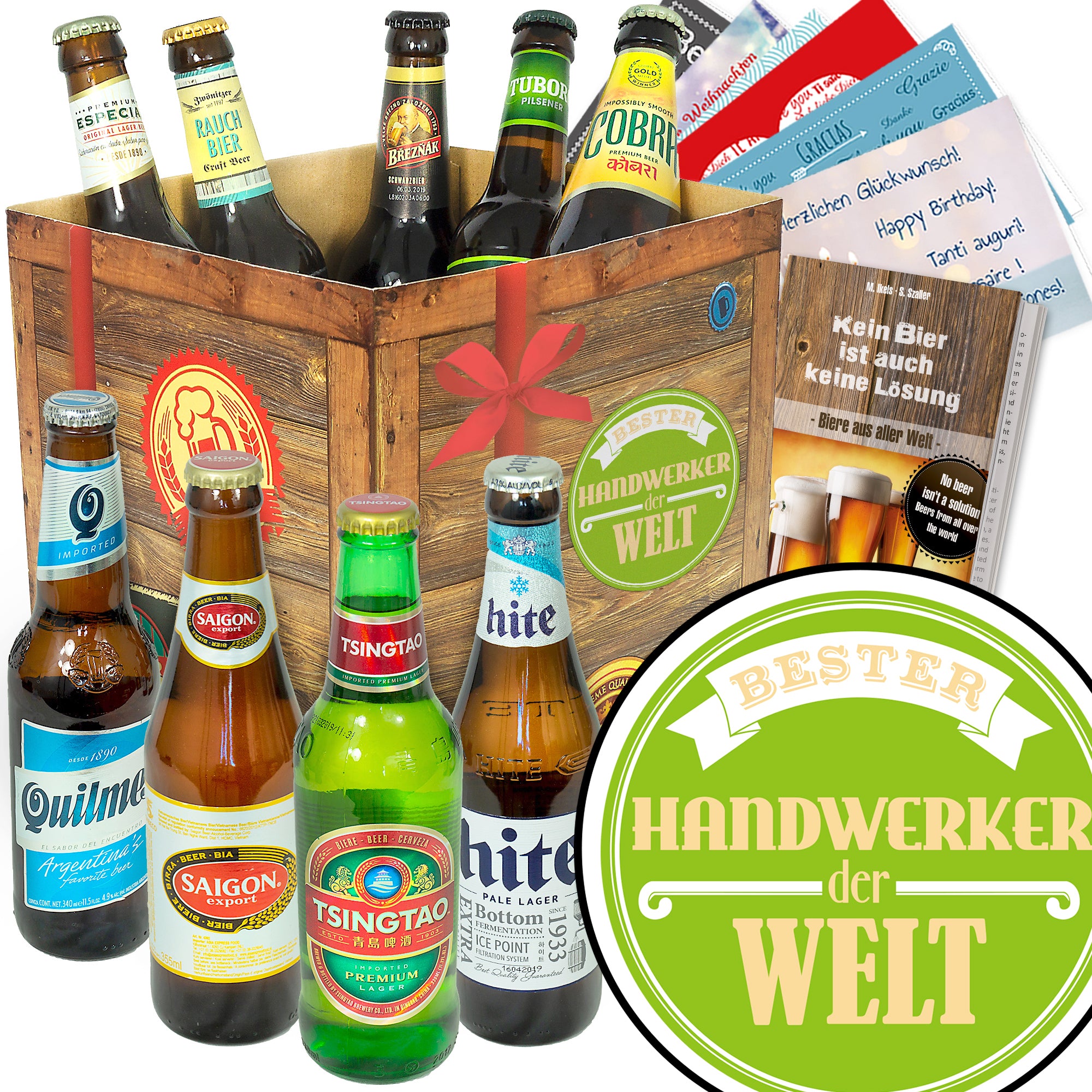 Sie erhalten 9x internationale Spitzenbiere renommierter Brauereien der ganzen Welt + Geschenkkarton in edler Holzoptik (wiederverschließbar) + 6 Geschenkkarten + 3 personalisierbare Urkunden + Bierbewertungsbogen + Gratis Bierbuch (A6, 104 Seiten, Wert €5,95) mit interessanten Infos: Wissenswertes zu den Bieren im Set, Gläserkunde, Bierspiele,...