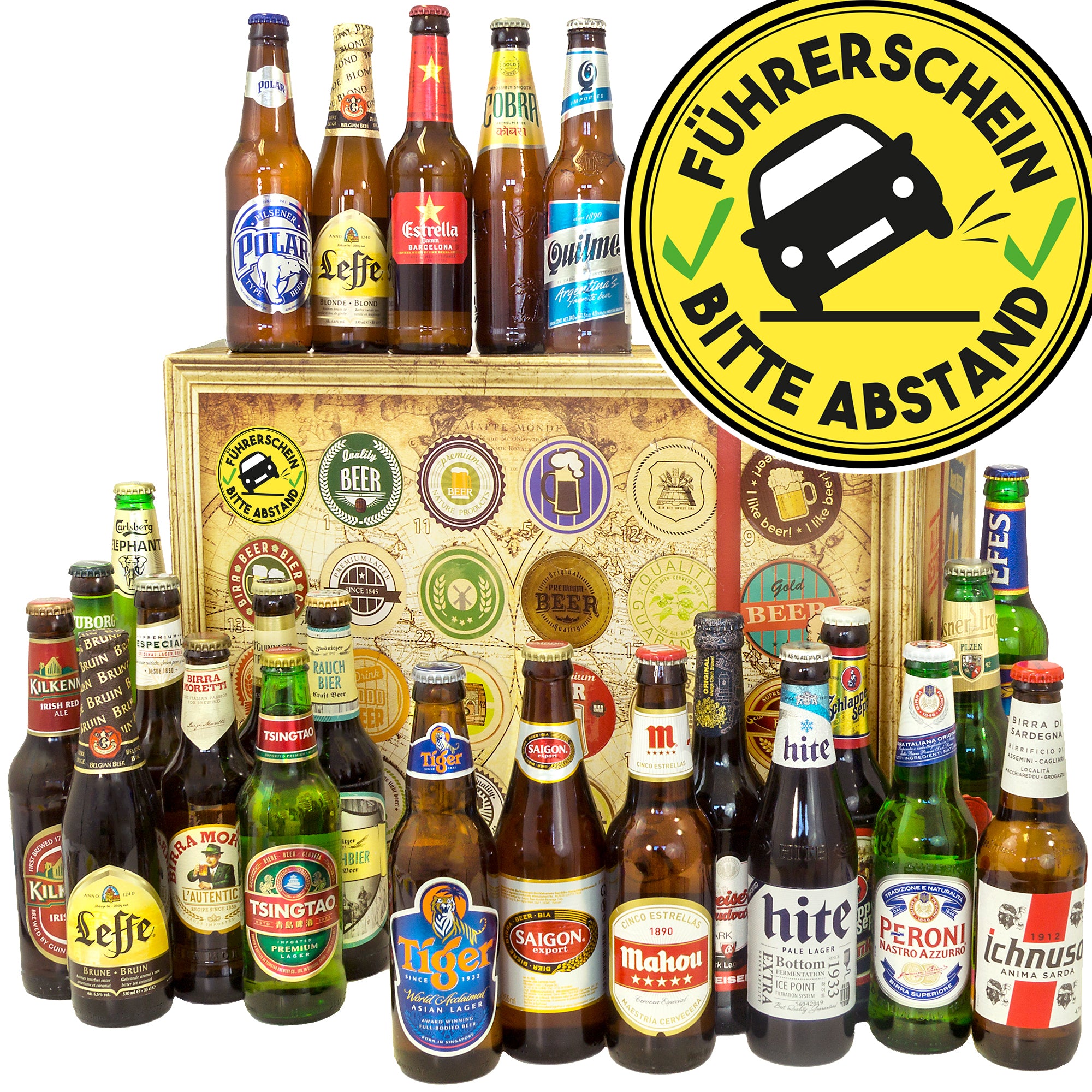 Führerschein bestanden – Bitte Abstand | 24 Spezialitäten Biere Welt und Deutschland | Geschenkbox
