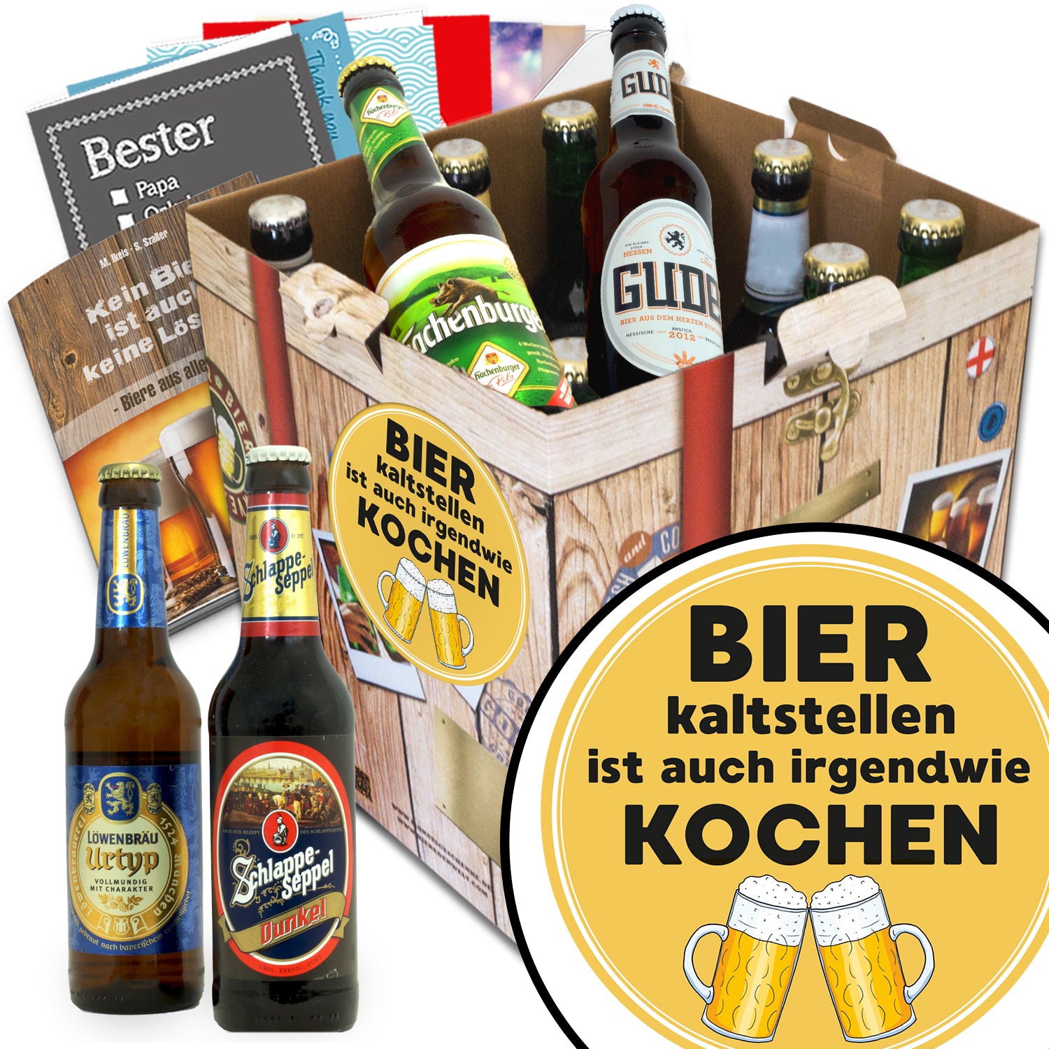 Sie erhalten: 9x deutsche Biere renommierter Brauereien aus ganz Deutschland + Geschenkkarton in edler Holzoptik (wiederverschließbar) + 6 Geschenkkarten + Bierbewertungsbogen + Gratis Bierbuch (A6, 104 Seiten, im Wert von €5,95) mit Vorstellung der bestellten Biere sowie weiterer internationaler Sorten. Dazu jede Menge interessante Infos im Bierbuch: Wie wird Bier hergestellt? Welches Glas für welche Sorte Bier? Wie prostet man in anderen Ländern? Dazu beliebte Bierspiel-Anleitungen. Außerdem ausgefallene Bier-Geschenk-Tipps - Wie wäre es z.B. mit einer Übernachtung im Bierfass?