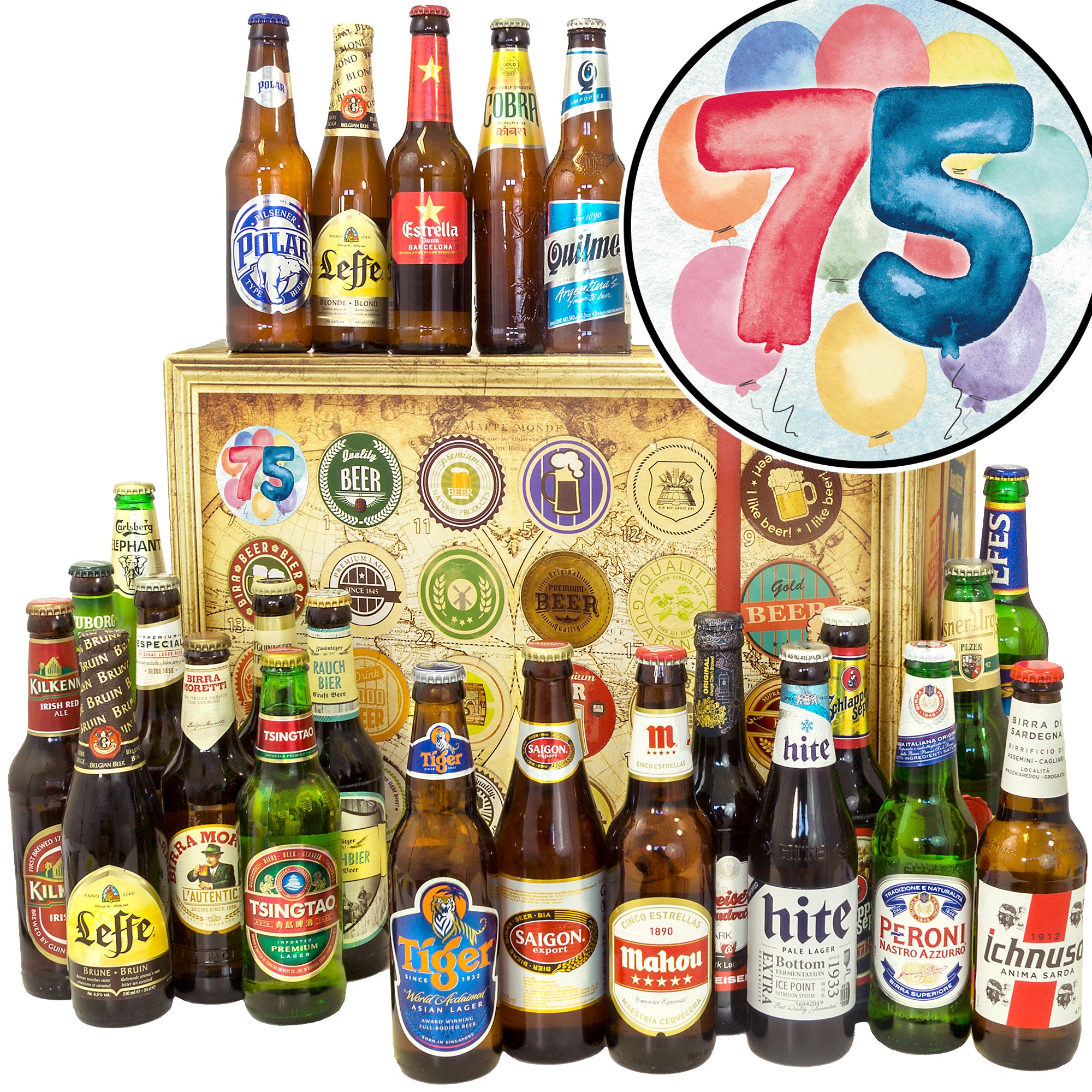 Geburtstag 75 | 24x Bier aus aller Welt | Geschenkkorb